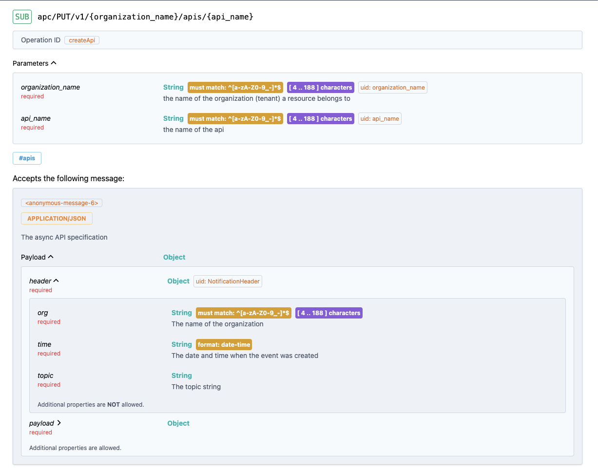 There are Async APIs for speparate groups of events. These groups mirrot the groups (tags) used in the Connector’s OpenAPI This allows to offer one or more specific sets of notifications as API Products for consuming applications.